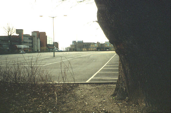 | 4.1 The replacement Methodist church on Holwood Road (the previous one on the High Street having been replaced a few years ealier) in 1988. | 4.2 Two years later and space is being made for the Glades. The Churchill theatre and Central Library behind. | 4.3 The car park before being covered by Glades and Pavilion Leisure Centre. The Quercus oak still survives (after a struggle) and is just visible on the right of picture 3.2. | 4.4 The end of Kentish Way in 1990 when it turned right into Elmfield Road. The remains of Love Lane is in the trees on the left (compare with picture 3.2.) |