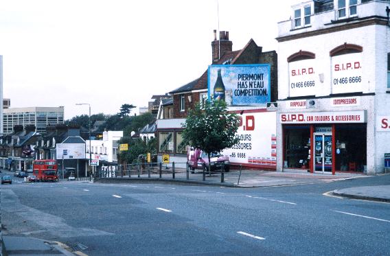 | 4.5 A reflective picture from what is now the ground floor car park inside the Pavilion Leisure Centre. Cunningly, you can't see my reflection! | 4.6 Looking down Palace View from beside the Bank of America building. Kentish Way now cuts across the pictue and, sadly, this useful short cut to the station can now only be done on foot. | 4.7 Masons Hill in 1988. The buildings in the foreground have been replaced by Kentish Way. This can be compared with the next picture as well as Picture 3.4 | 4.8 The junction of Masons Hill with Kentish Way in June 2000. The white building (Victoria House) behind the lamp post can be seen in the previous picture. |