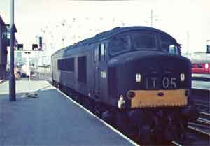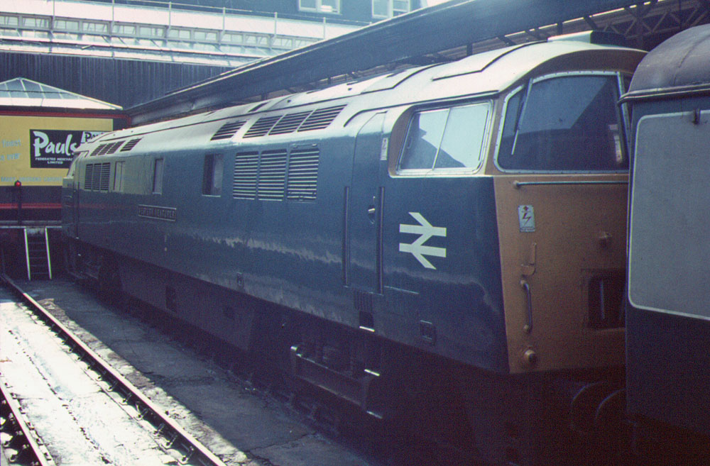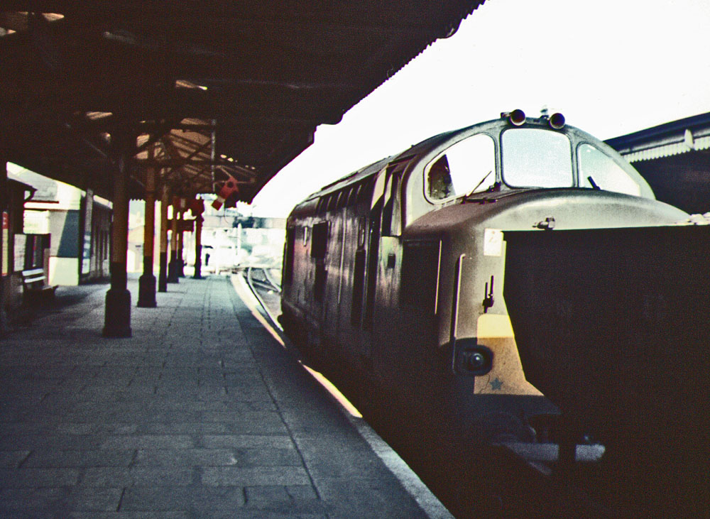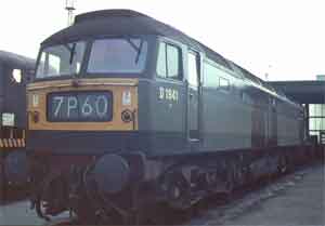 D1.5. D1000 in "Desert Sand" livery at Old Oak Common - it was only when this picture was developed I realised I had an audience! | D1.6. D1005 at Swansea having just arrived from London | D1.7. Another view of the same engine departing the station | D1.8. D1021 passes stored steam engines at Severn Tunnel Junction, August 1967. |